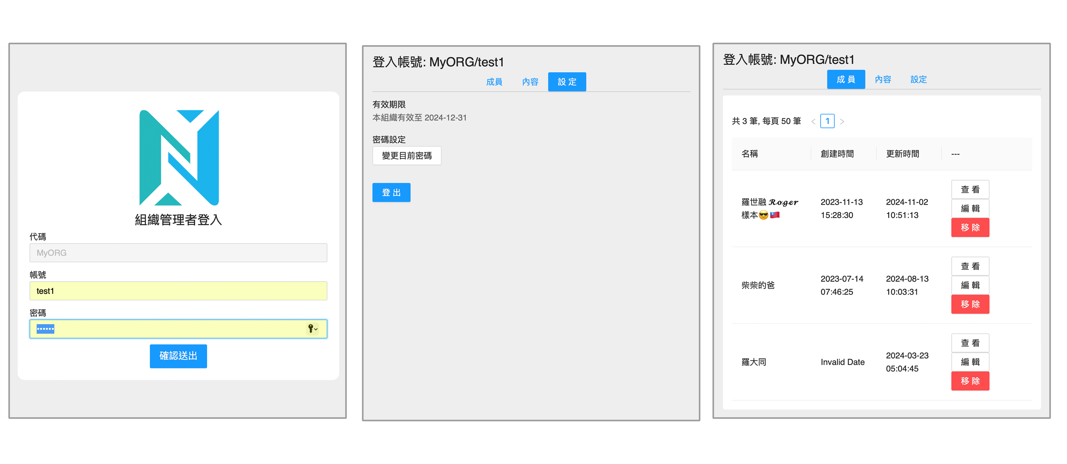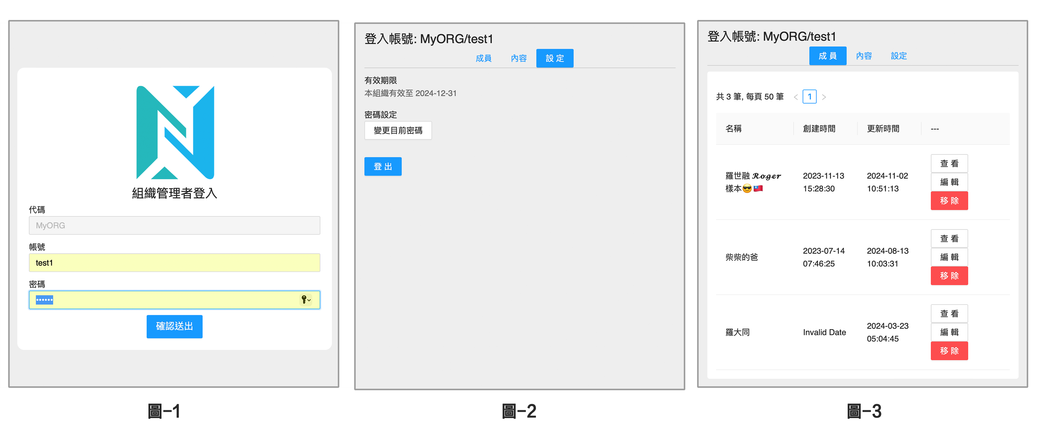 切換至 成員 頁面 (圖-3),可以看見目前帳號內所有成員的列表,可以針對每個成員進行 查看 、 編輯 、 移除 等: