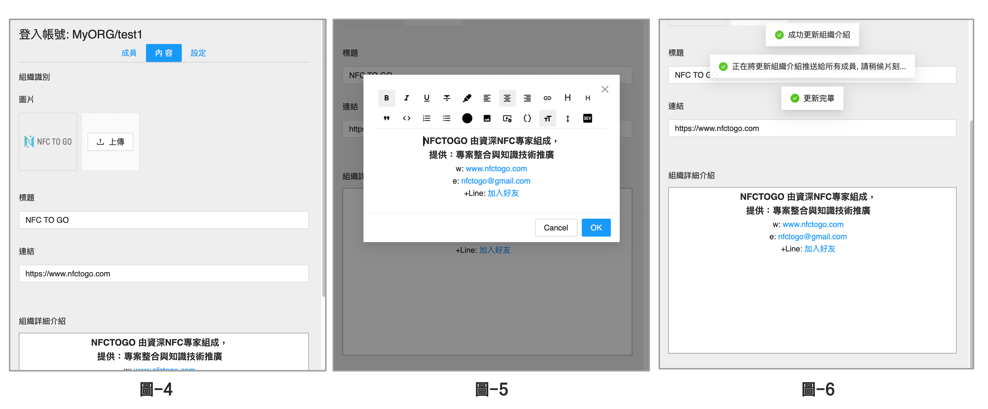 切換至 內容 頁面 (圖-4),來初次建立或編修組織的識別與資訊內容: