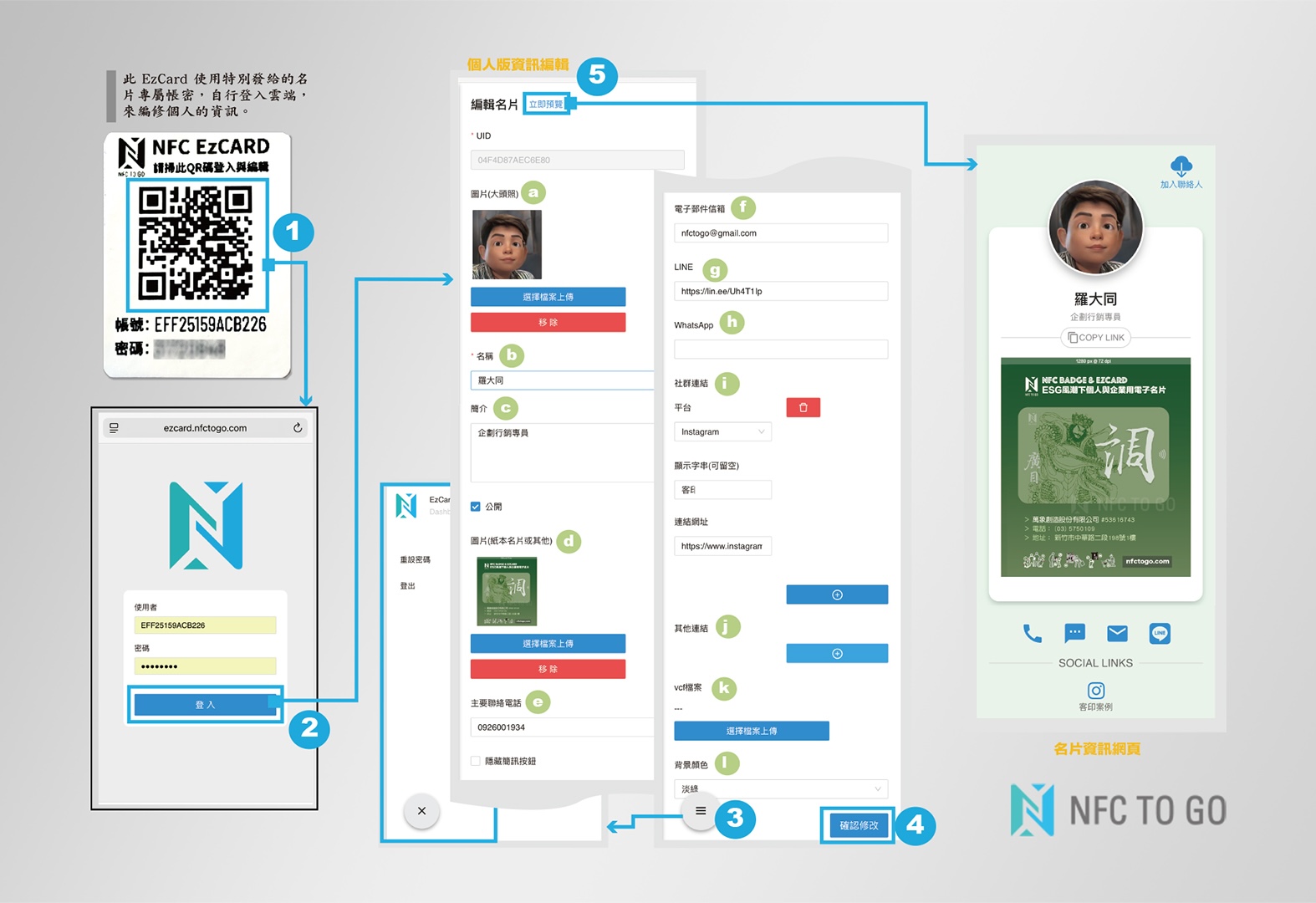 在 編輯名片 頁面,可以直接滑動來編輯各欄位的資訊內容;在頁面最上方可以按 立即預覽 下圖5來檢視名片呈現樣貌: