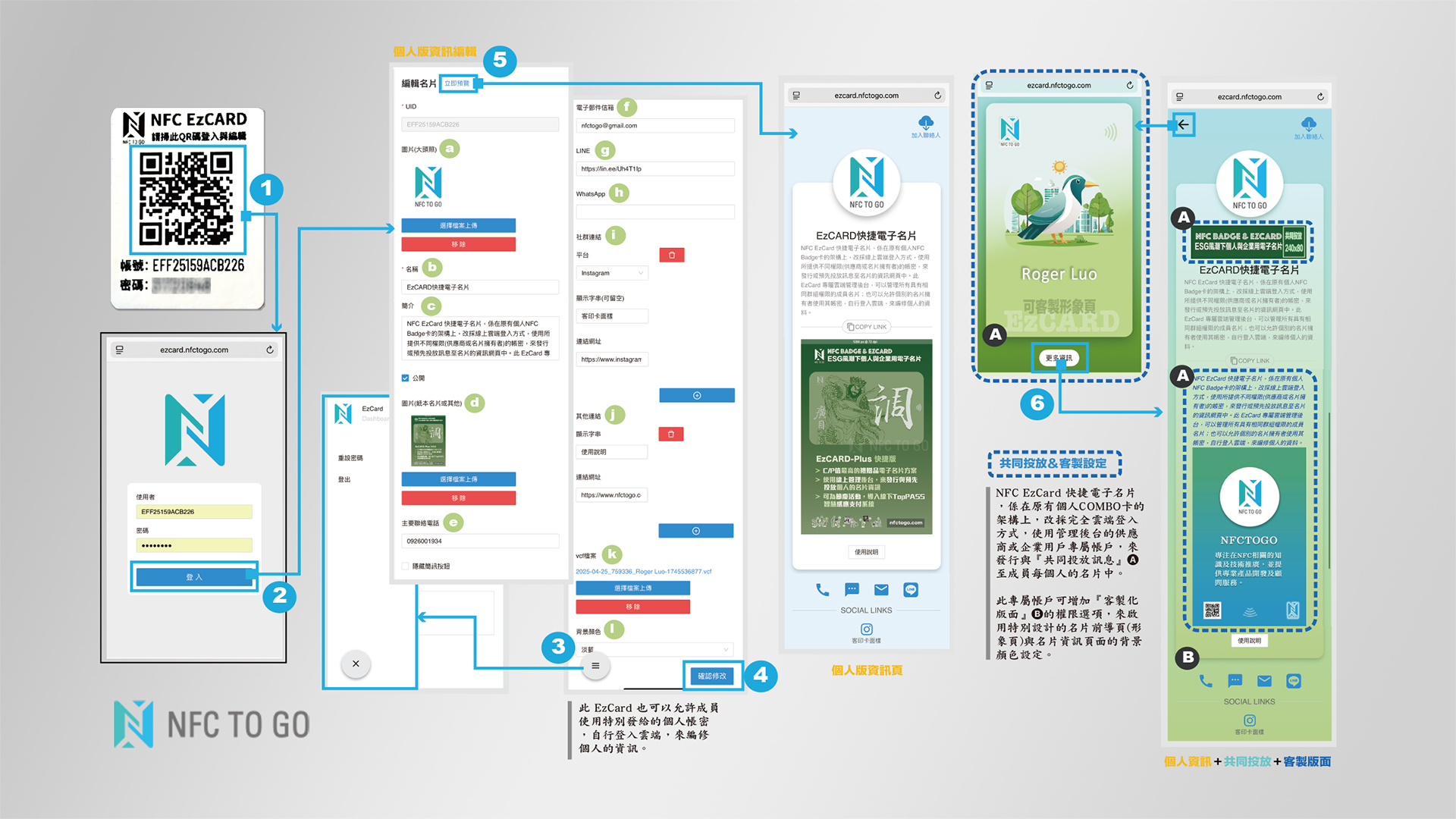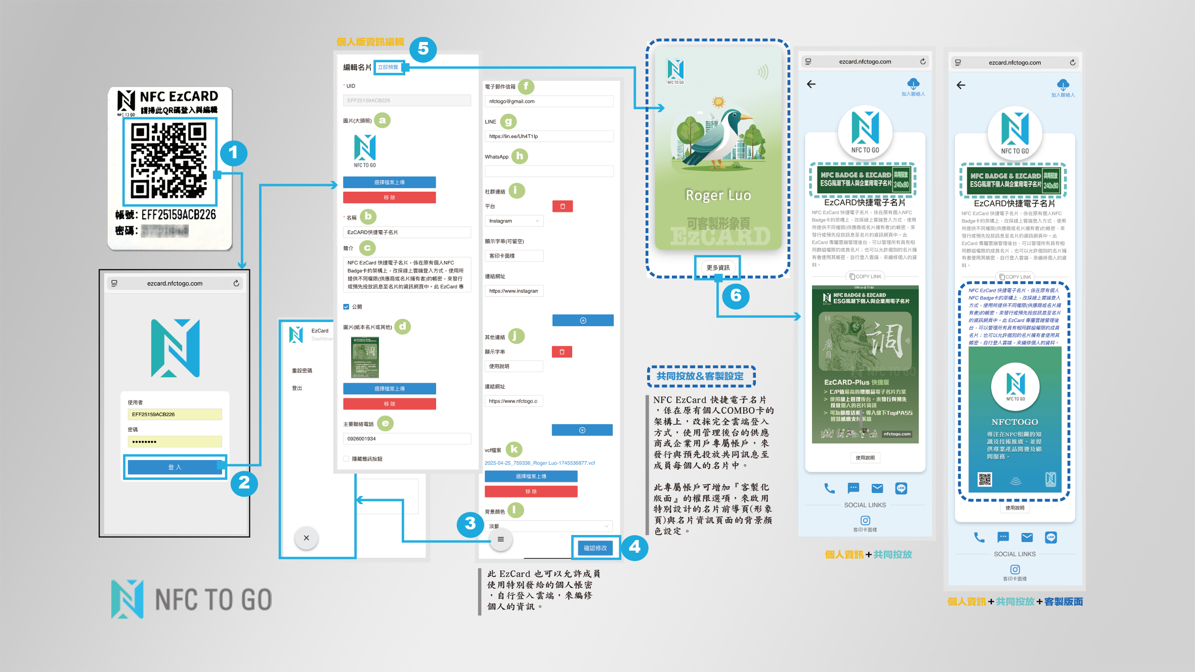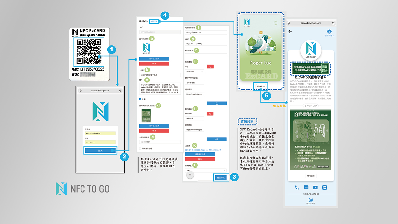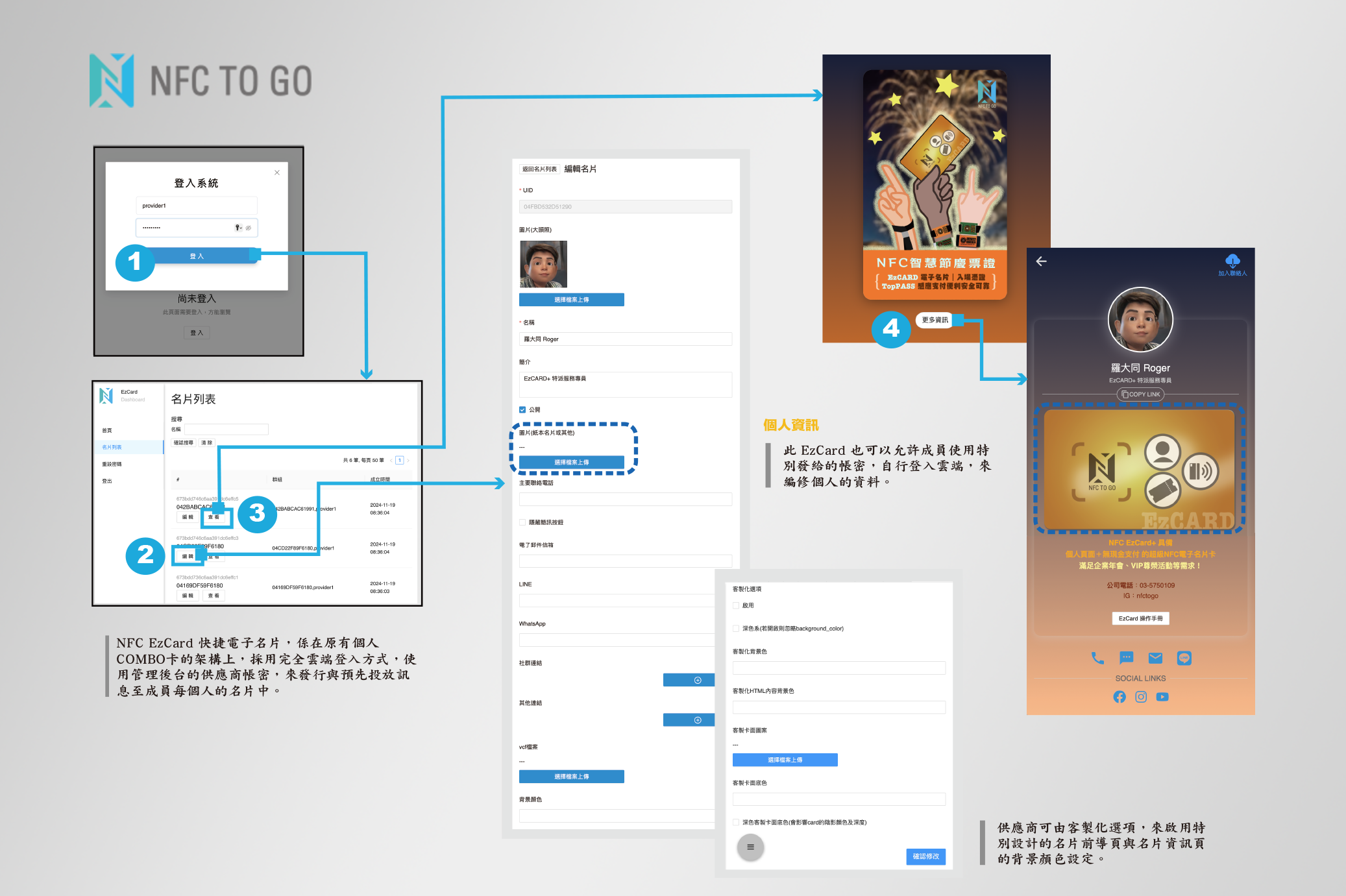 NFC EzCard 快捷電子名片,係在原有個人NFC Badge卡的架構上,改採線上雲端登入方式,使用所提供不同權限(供應商或名片擁有者)的帳密,來發行或預先投放訊息至名片的資訊網頁中。此 EzCard 專屬雲端管理後台,可以管理所有具有相同群組權限的成員名片;也可以允許個別的名片擁有者使用其帳密,自行登入雲端,來編修個人的資料。$