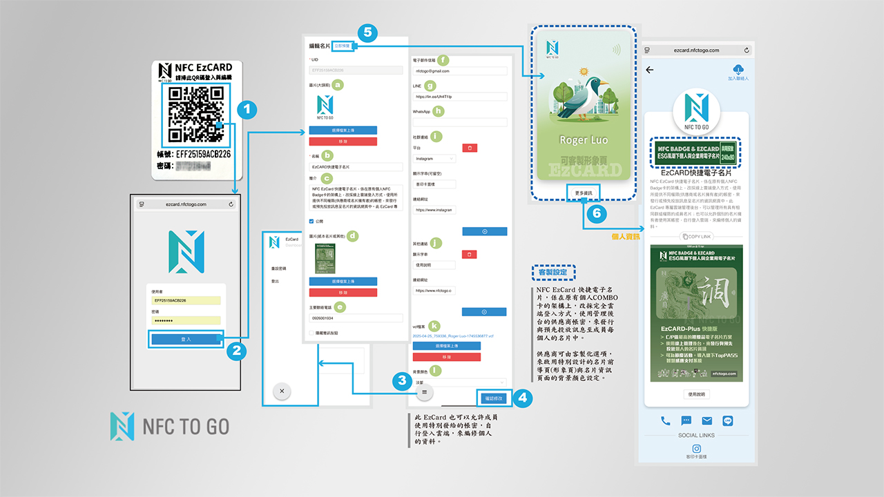 你必須取得由 NFCTOGO 派發的帳號與密碼,先依指示掃描登入QR碼,前往$ 登錄$ 頁面。然後輸入帳號名稱與密碼,然後按 確認送出 ,即可進入此卡的編輯頁面 下圖2,在首頁左側邊欄 下圖3 有2個功能選項,依序為: 重設密碼 、 登出。