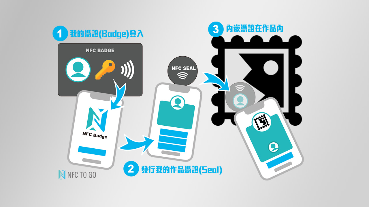再來是所謂的『NFC Badge金鑰卡』,是一張兼具電子名片與個人簽證功能的卡片;當然不同於名片卡的是多了一把隨機生成的加密『私鑰(Private Key)』,使用相當於區塊鏈相同等級的加密演算法,可以透過『NFC Badge』APP來製作電子簽章(Signature),並寫入到同樣以 NFC 標籤 (Tag) 製成的憑證貼標 (Seal Sticker) 內;然後你可以去編輯此憑證的資訊主頁,並將 $ Seal標籤 貼到自己的作品上$ 。