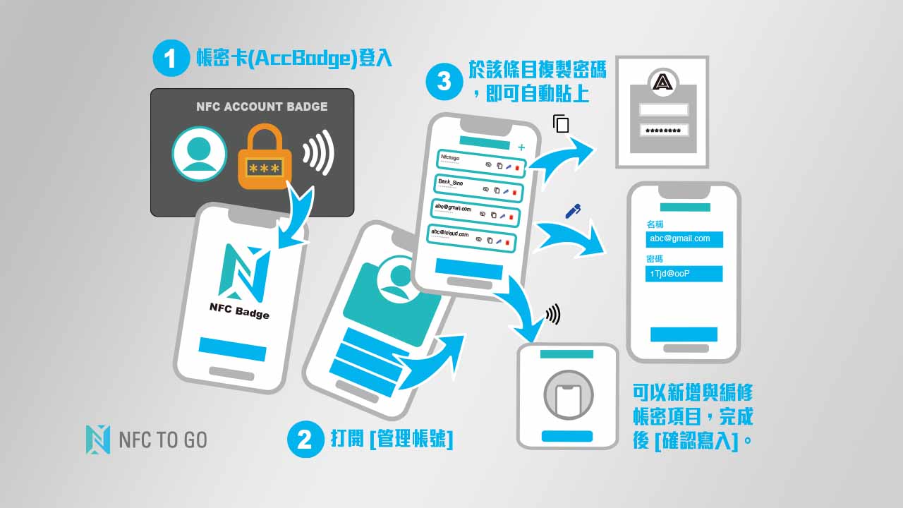 『NFC Badge帳密卡』採用NTAG系列大容量記憶體的晶片,除可以作為一般 NFC電子名片來使用之外;還內含一 $ 帳密管理$ 記錄本,可紀錄自己常用的帳戶名稱與密碼於卡片。